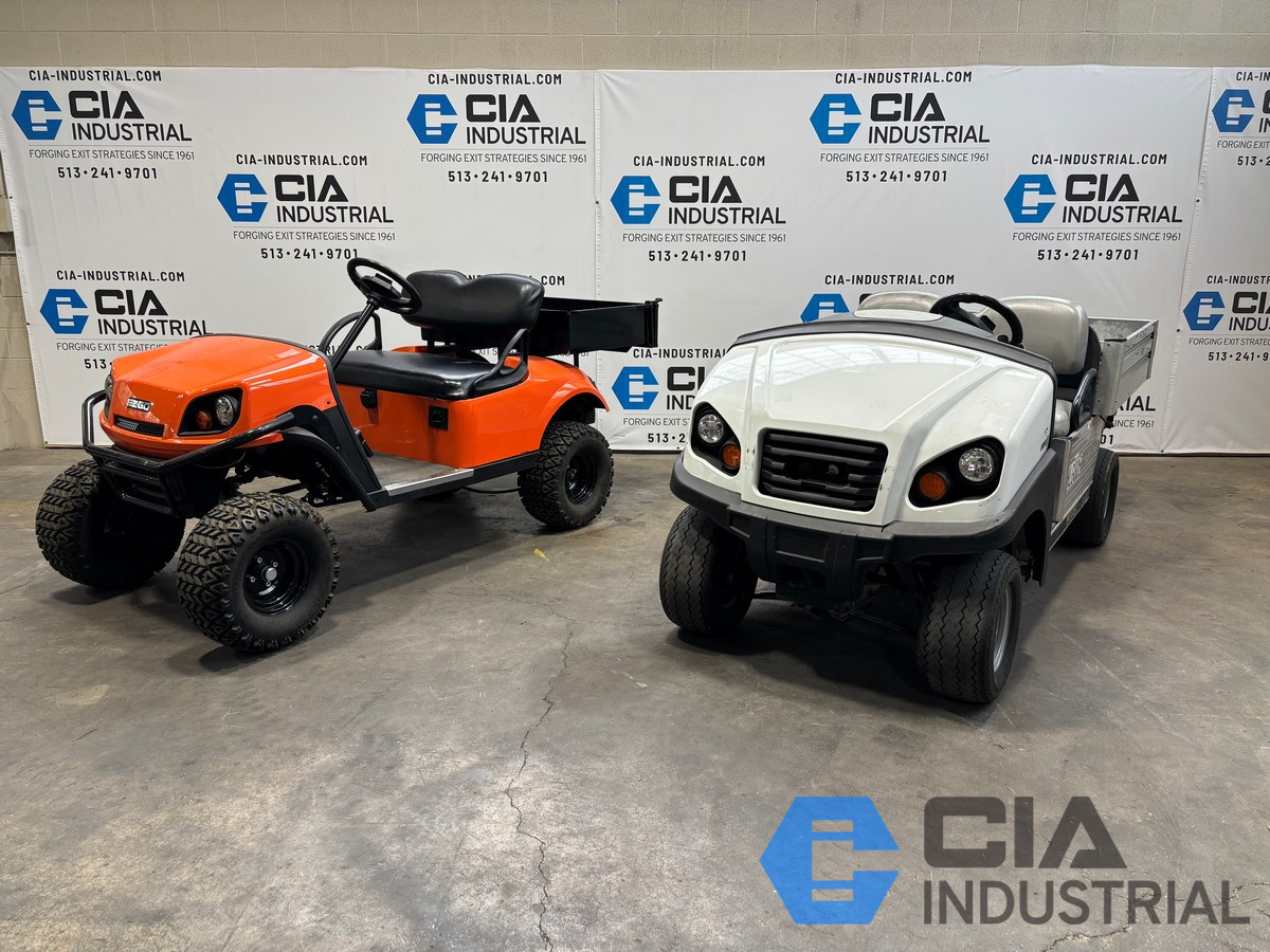• (2) 2018/2010 E-Z-Go Model TXT Fleet Lifting Electric 2-Person Golf Carts with Dump Beds